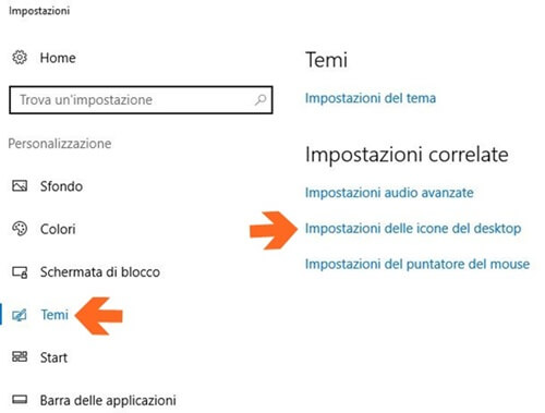In questa schermata puoi fare diverse personalizzazioni. Nel menù a sinistra clicca su Temi e poi clicca su Impostazioni delle icone del desktop che è la funzione che ci interessa