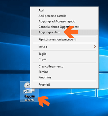 Cliccando con il tasto destro del mouse sull’icona Oggetti recenti potrai sia aggiungerla al menù Start o Cancellare l’elenco degli Oggetti recenti.